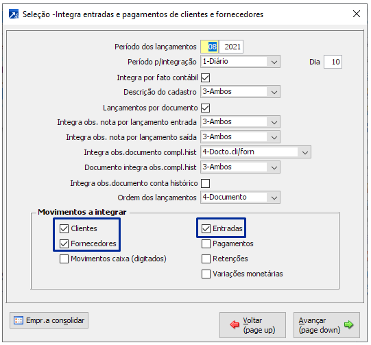 Obs.: Para integrar neste formato é necessário desmarcar o campo "Integra por fato contábil".