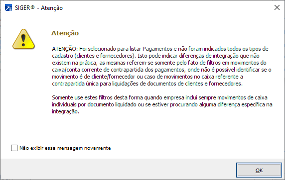Assim sendo é possível fazer a combinação de movimentos a integração, contudo se houver a possibilidade de gerar inconsistência na integração, como lançamentos sem contrapartida, o SIGER® alertará com a mensagem, como essa a seguir, alertando que não foi selecionado o campo de tipo de cadastro (cliente/fornecedor), o que pode ocorrer em diferenças na integração, havendo divergências entre os valores de débito e crédito, o lote não será integrado na contabilidade.