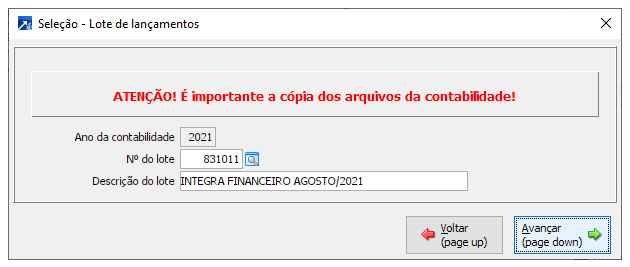 Neste exemplo serão integrados todos os movimentos a integrar, então a descrição do lote será "INTEGRA FINANCEIRO AGOSTO/2021", se estiver integrando somente entradas ou liquidações, pode ser utilizada a descrição "INTEGRA ENTRADAS AGOSTO/2021" ou "INTEGRA PAGAMENTOS AGOSTO/2021".