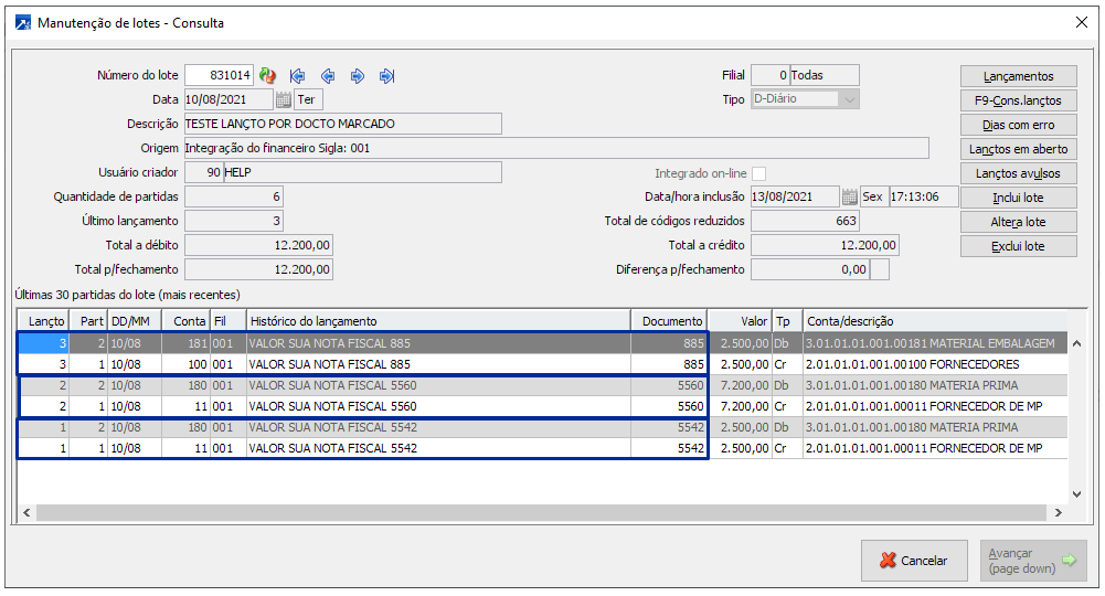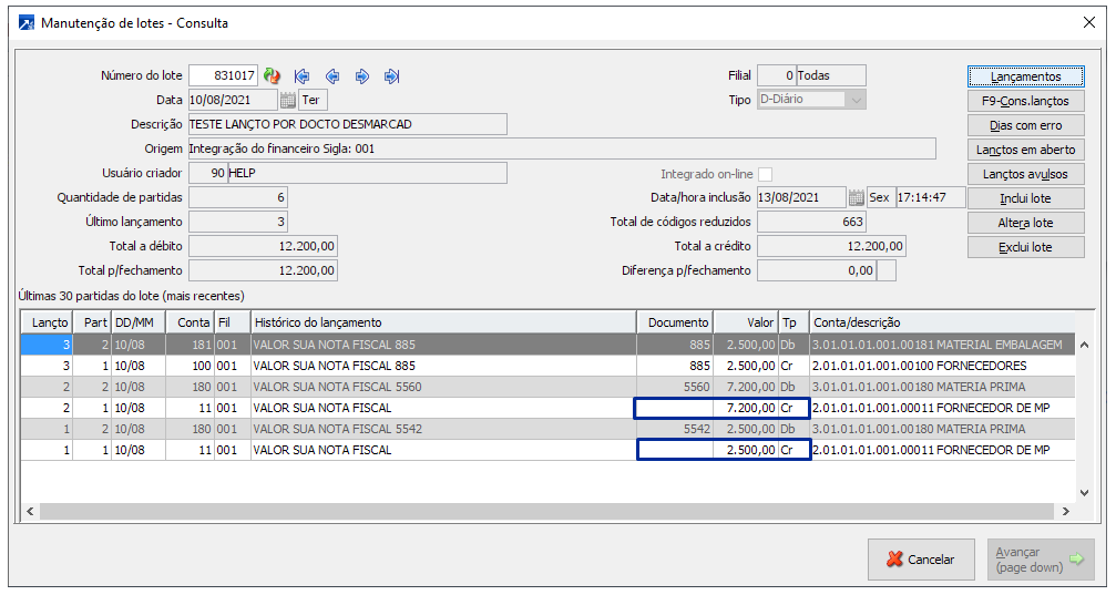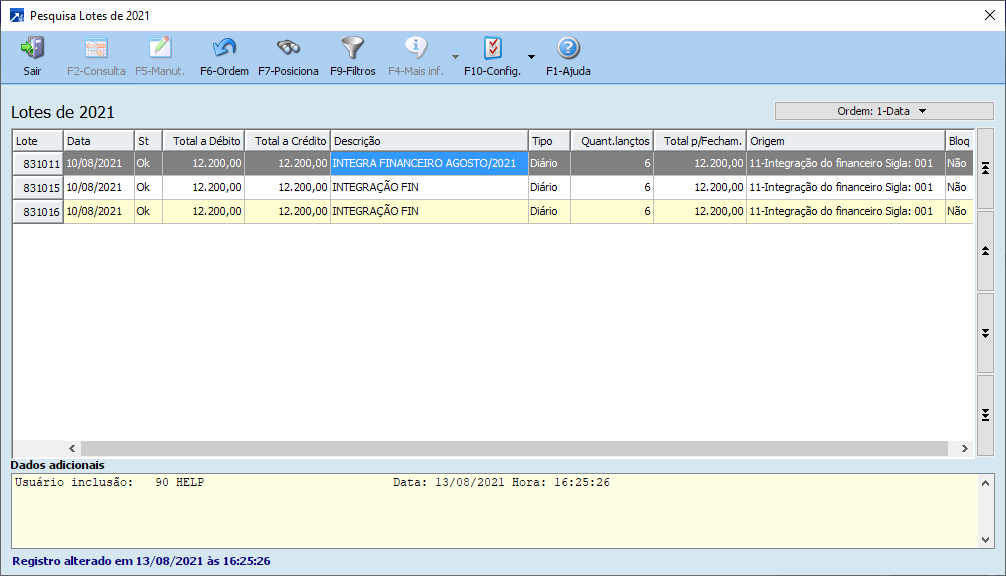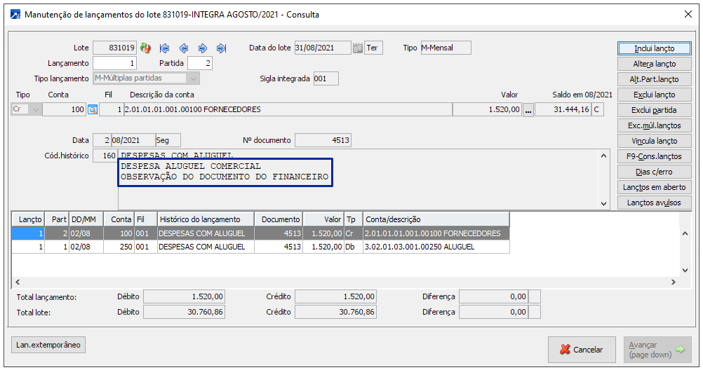 Exemplo da integração na consulta do lote contábil, menu CTB 2.1-C.