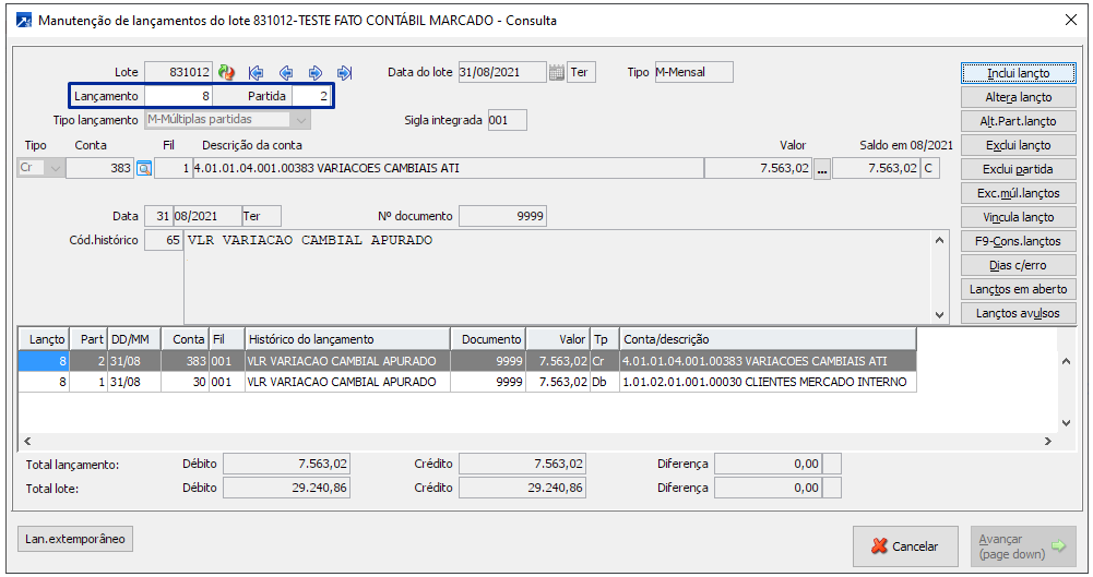 Exemplo dos lançamentos com o campo marcado, o lote contábil possui 8 lançamentos, separando cada fato contábil num lançamento distinto.