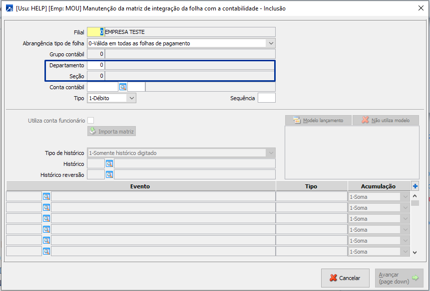 Ao incluir a matriz de integração no MENU 4.A-I SIGER® vai abrir o campo DEPARTAMENTO e campo SEÇÃO.