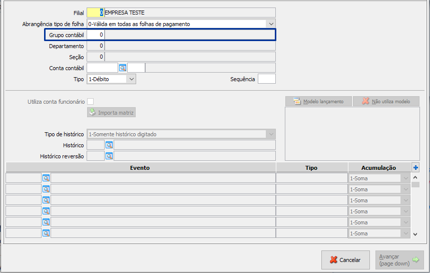 Para facilitar o cadastramento da integração contábil da folha de pagamento por grupo contábil, foi disponibilizada a criação da tabela "Grupo Contábil" MENU 1.4-M tabela 8. Após cadastrar todos os grupos contábeis, será necessário informar o grupo em cada departamento da folha de pagamento no MENU 1.4-M tabela 2. Desta forma ao incluir a matriz de integração no MEU 4.A-I vai habilitar o campo para informar o grupo contábil.