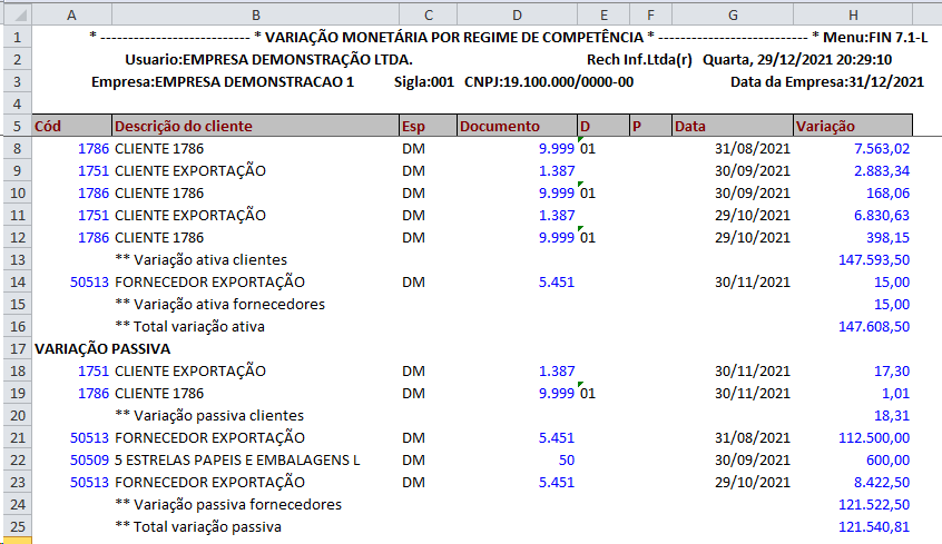 A listagem da variação monetária é emitida no menu FIN 7.1-L (List.Var.Mon.p/Reg.Compet.).