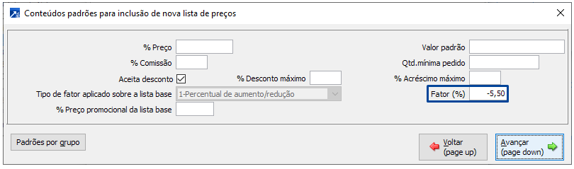 b. No botão <Padrões p/cad>, informar no campo "Fator (%)" o percentual padrão que deve ser aplicado sobre a lista base, assim qualquer produto ao ser cadastrado já vai iniciar com esse percentual, conforme demonstrado na imagem a seguir.