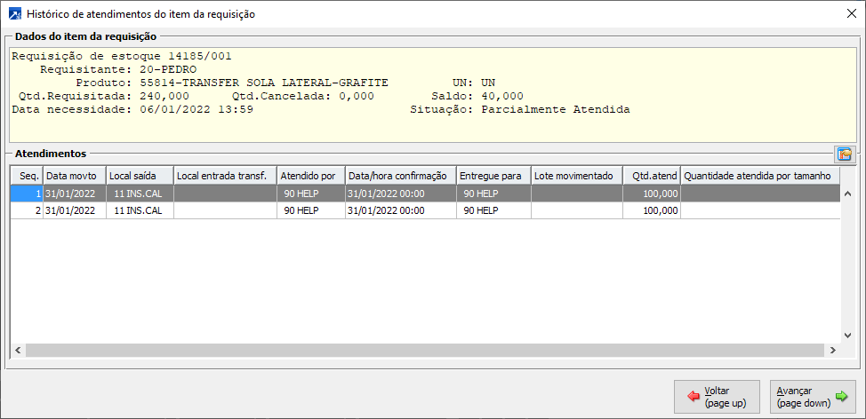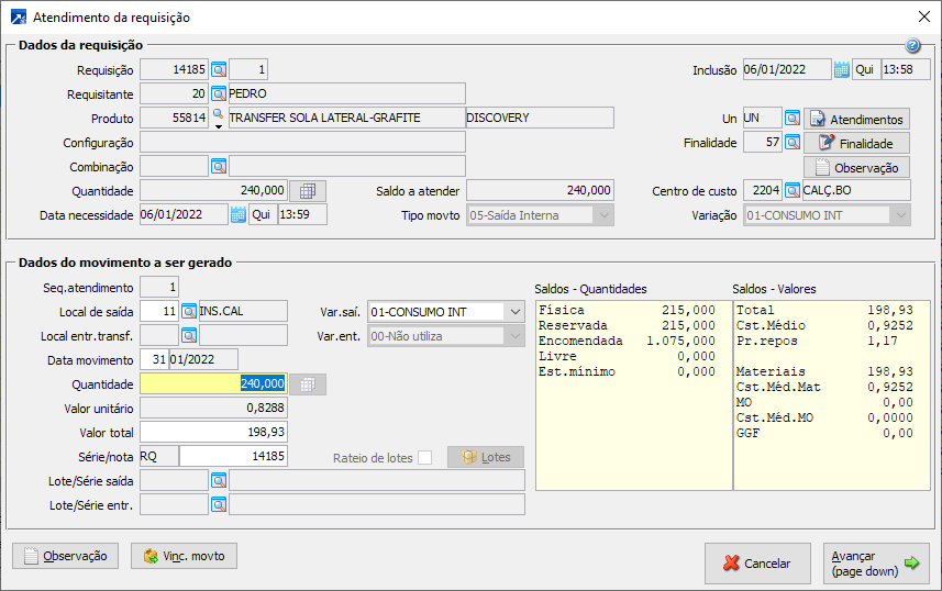 Atender requisição: Atende o TODOS itens da requisição selecionado no grid, fazendo uma saída ou transferência do material do estoque