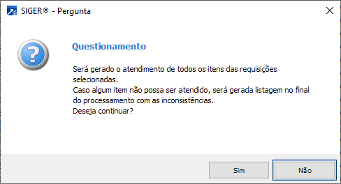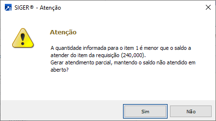Quando a quantidade atendida é menor que a quantidade total do item da requisição, o sistema exibe mensagem questionando se deve permanecer o saldo em aberto (abaixo):