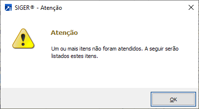 Caso algum item não possa ser atendido, será exibida mensagem (abaixo), e na sequência um relatório de inconsistência