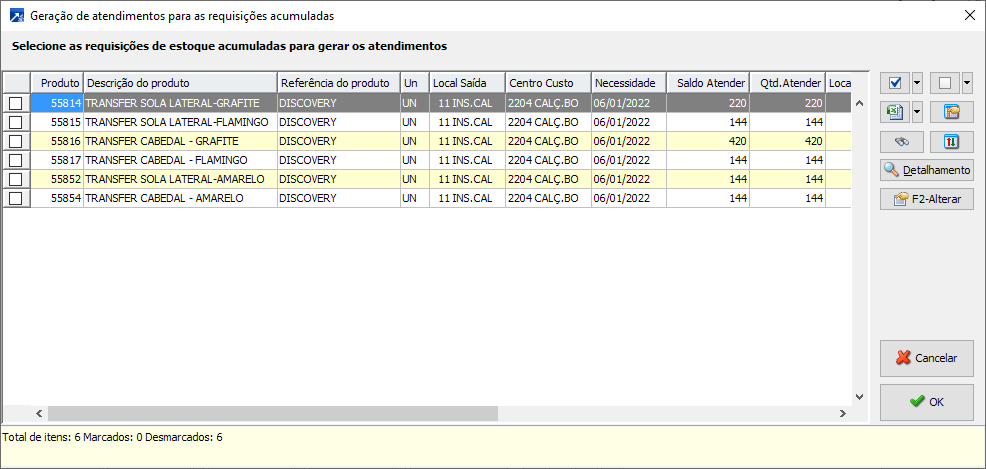 No botão <Detalhamento> exibe os itens de requisições que foram agrupados (abaixo):