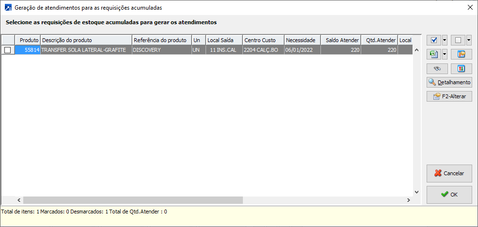 Atender requisição acumulada: abre janela com TODOS itens de requisição do grid (manutenção cosolidada), acumulando suas quantidades em um novo grid (independente dos marcados).
