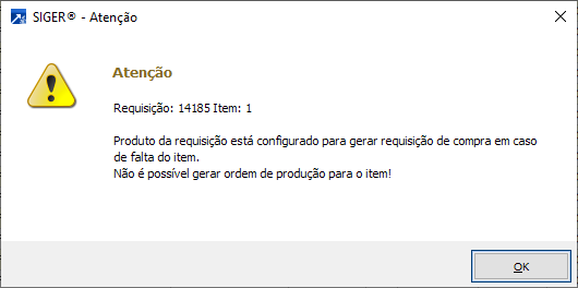 É necessário que o tipo de ressuprimento do item (cadastro do produto, botão <Estoque/Compras>) seja "1-Gera OP" ou "2-Manual (padrão Gera OP)", caso contrário será exibida mensagem informativa (abaixo):