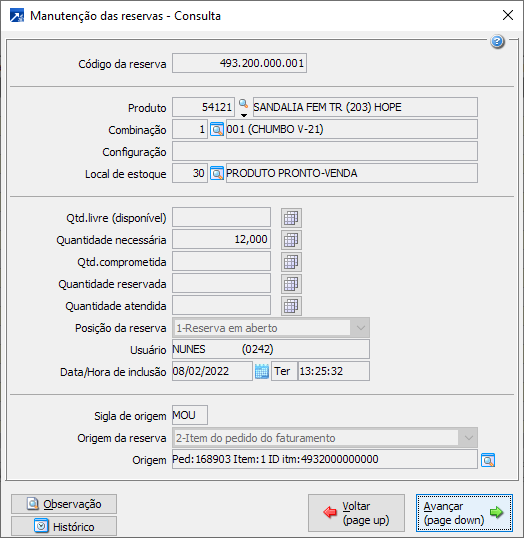 Consulta/acesso direto a janela de observações da reserva selecionada.