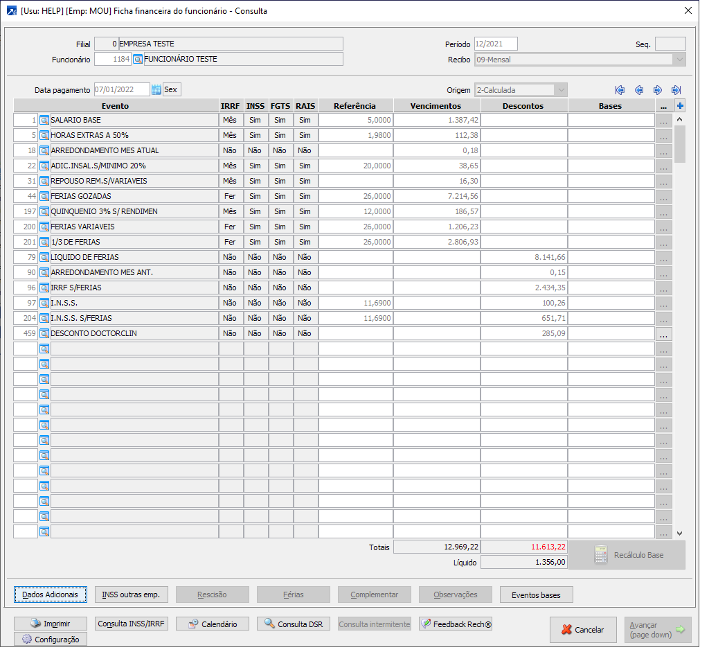 - Botão <Dados Adicionais> contém informações sobre o cálculo da ficha, referente aos dados do funcionário e dados da ficha, exemplo: departamento, seção, centro de custo, salário, horas semanais, identificação do recibo para eSocial, entre outras informações.