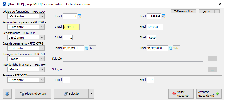 Ao entrar no MENU 3.9-M SIGER® listará no grid todos os funcionários que tiveram pagamentos na competência de processamento da folha, para listar outras competências, utilizar o botão <F9-Filtros>