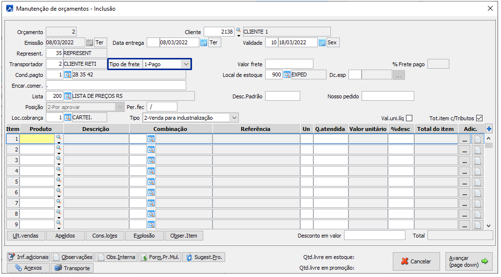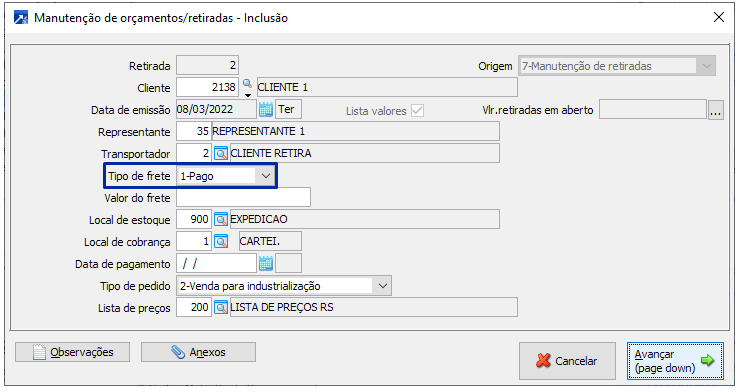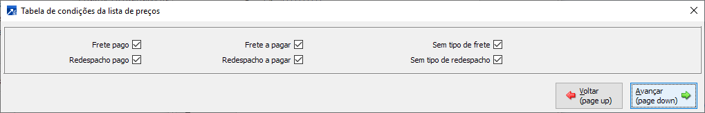 Frete a pagar: Permite utilizar lista de preço se frete for do tipo "a pagar"