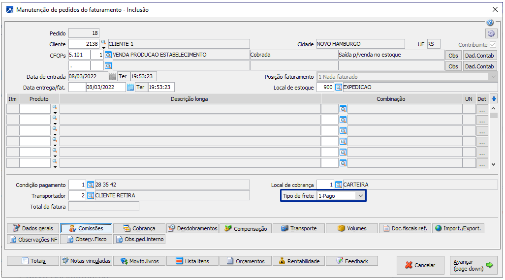 Como identificar o tipo de frete nas entidades de orçamentos, retiradas e pedidos.