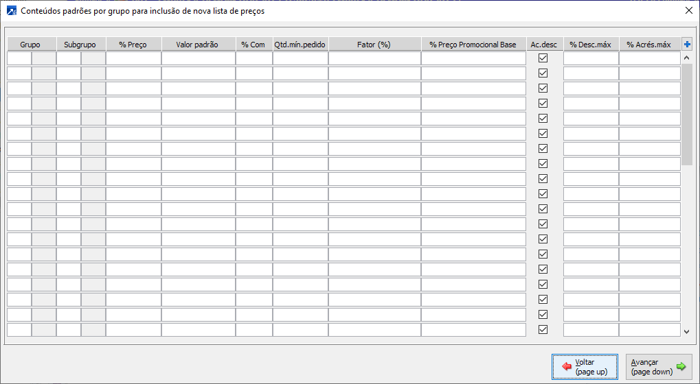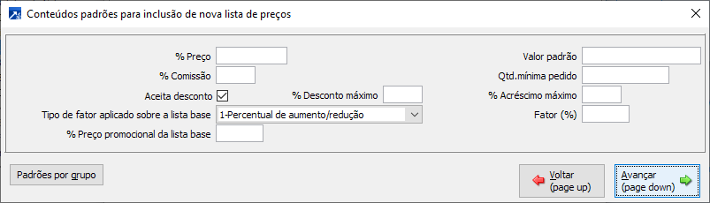 Botão <Padrões por grupo>: Neste é possível definir padrões por grupo e subgrupo de produtos ao qual a lista de preços deve pertencer para que os conteúdos padrões sejam carregados.