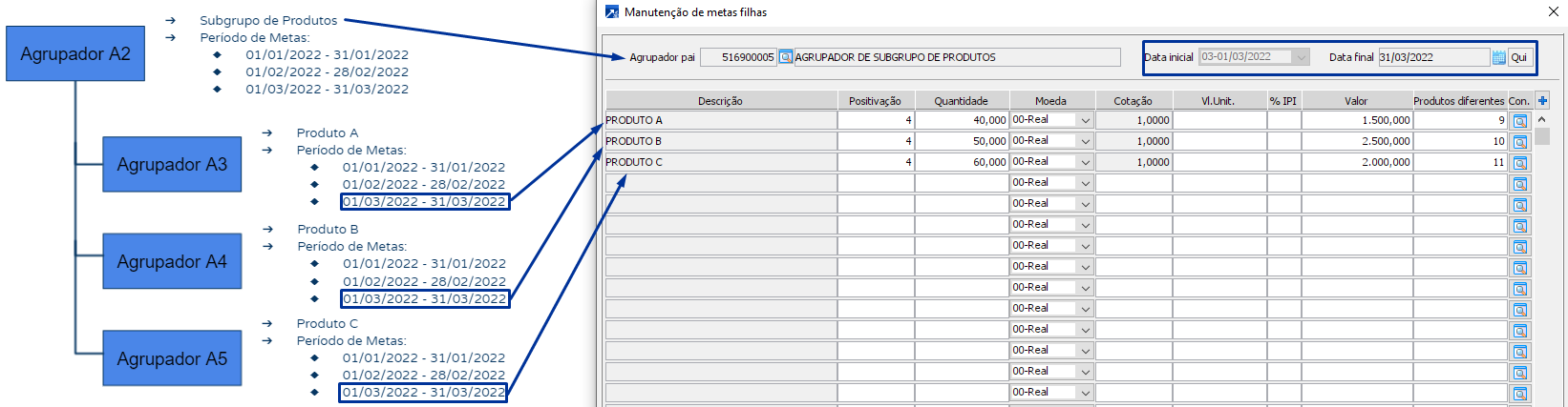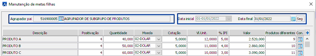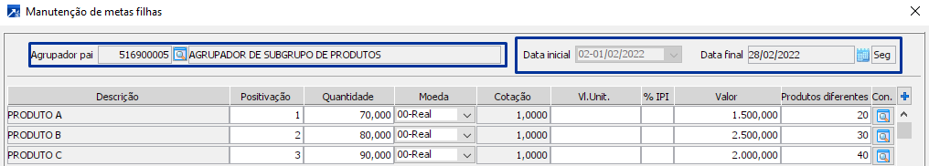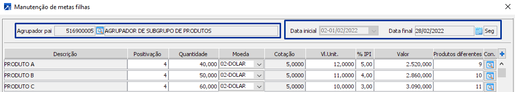 Para melhor exemplificar a forma como são carregadas as metas para o grid podemos usar a imagem abaixo como referência. Na situação ilustrada temos na parte superior da janela o agrupador pai que é referente ao subgrupo de produtos e o período selecionado é 01/03/2022 - 31/03/2022. Ao definir estas informações o grid de metas filhas será carregado com todas as metas daquele mesmo período que estão gravadas nos agrupadores filhos. Os agrupadores filhos, nesse caso, referem-se aos produtos. Foram carregadas então 3 linhas para o grid, sendo cada uma delas referente a meta de um agrupador filho diferente mas no mesmo período que o selecionado para manutenção.