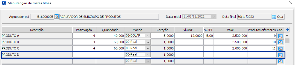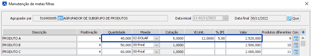 Ao ser informada a meta de quantidade e o valor unitário do produto, a coluna referente a meta de valor passa a ser calculada automaticamente, multiplicando o quantidade informada pelo valor unitário informado. Sobre esse valor calculado, se informada a cotação da moeda, a cotação também será considerada no cálculo do valor da meta. Ainda, caso seja informado o percentual de IPI do produto, esse percentual também será aplicado no cálculo para chegar ao valor final.