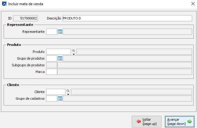 Ex.: Se selecionada a meta do período 01/01/2022 do agrupador "PRODUTO D" e excluí-la, será excluído o agrupador "PRODUTO D" e todas as metas de todos os períodos e não apenas a meta do período que está em manutenção no grid.