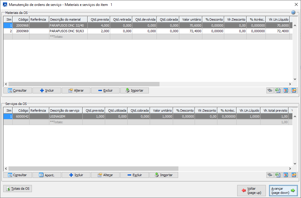 Grid consolidado dos Materiais e Serviços do item da Ordem de Serviço.