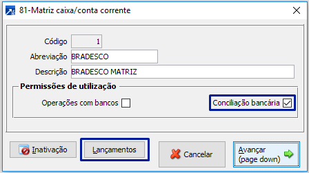 Caixa/corrente utilizado para criação do lançamento com a matriz.