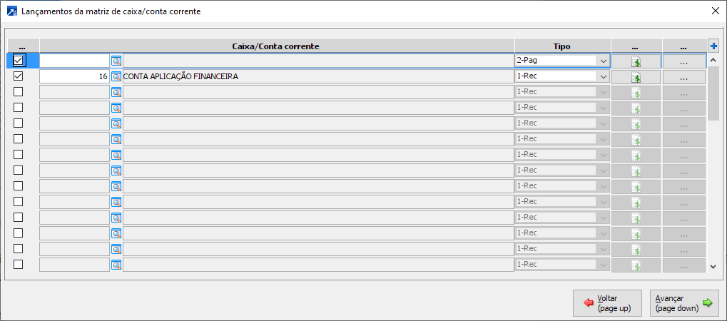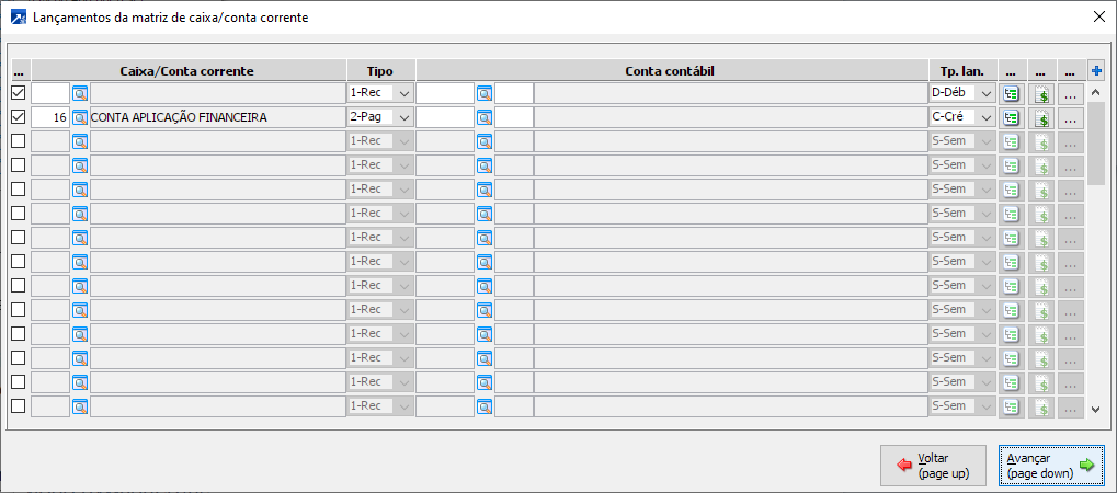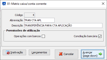 Essa matriz pode ser utilizada para gravar as transferências entre contas, como exemplo, os bancos que realizam automaticamente a transferência de valores da conta corrente para conta de aplicação, neste caso configurar dois movimentos para gravar a saída da conta de movimento (conta corrente) e a entrada na conta de aplicação financeira. Para esse movimento deve-se criar uma matriz para cada banco, pois na matriz será informada a conta de aplicação específica do banco.