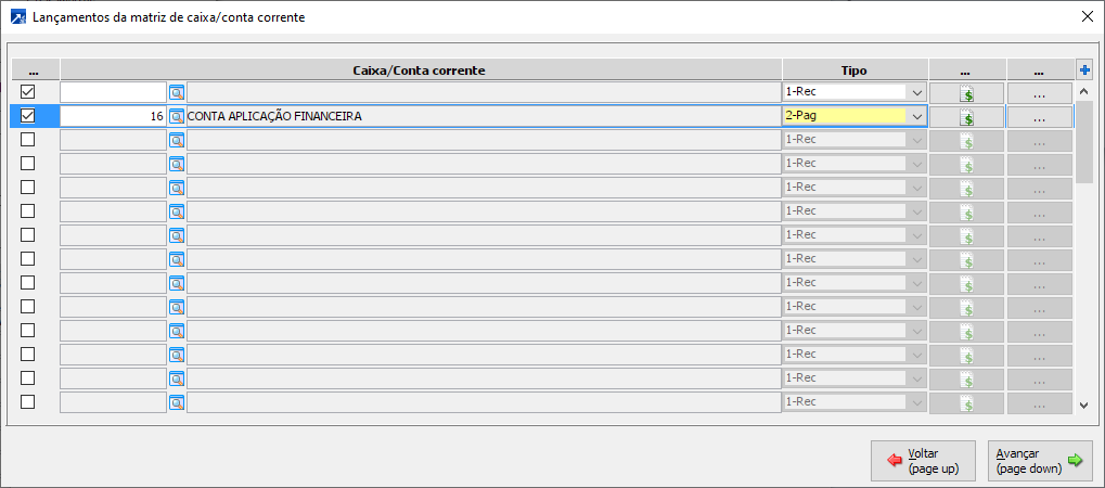 Para empresas que não fazem integração com a contabilidade, geralmente teremos apenas uma configuração com caixa/conta corrente e o tipo de lançamento.