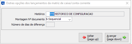 Exibirá a janela para configuração do histórico do lançamento e número de documento. Quando não informado, irá solicitar na criação do lançamento.