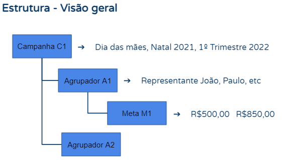 Conforme podemos verificar na imagem abaixo, a estrutura das metas de vendas avançadas foi pensada de forma hierárquica, de forma que está organizada em três níveis, sendo eles, Campanha de vendas, Agrupadores de metas e Metas de vendas.