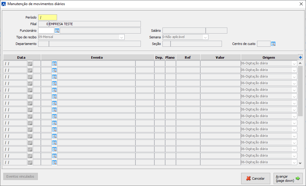 Centro de Custo: Informar em qual centro de custos deverá constar o evento a ser digitado.