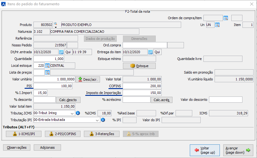 Imposto de Importação: Possui campo próprio no item do pedido para informar o valor.