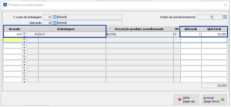 Tanto na inclusão desta ordem de produção quanto na hora de seu apontamento, temos acesso a tela de "Produtos acondicionados".