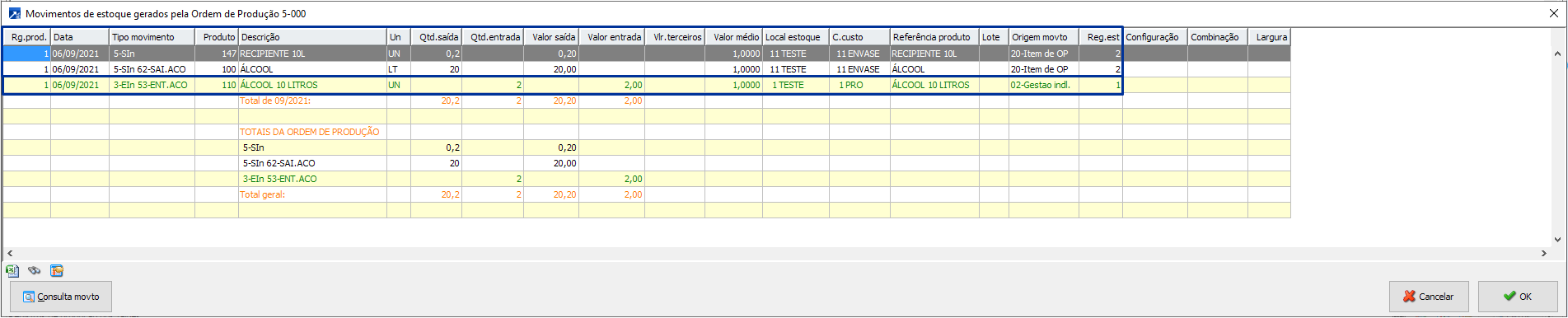 Movimentos de estoque gerados no apontamento da ordem de acondicionamento