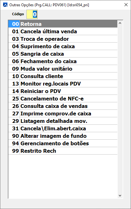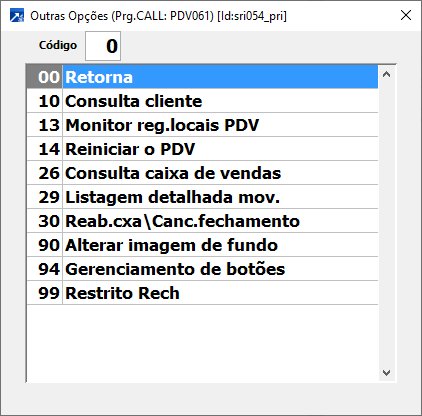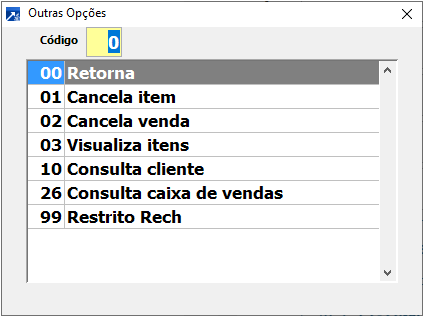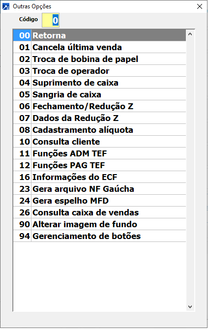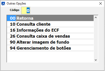 Esta funcionalidade possibilita o acesso a recursos gerenciais do ponto de venda, permitindo digitar a opção desejada ou acessar via duplo clique com o mouse.
