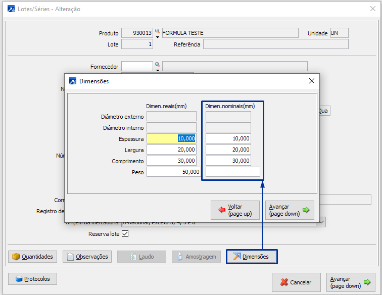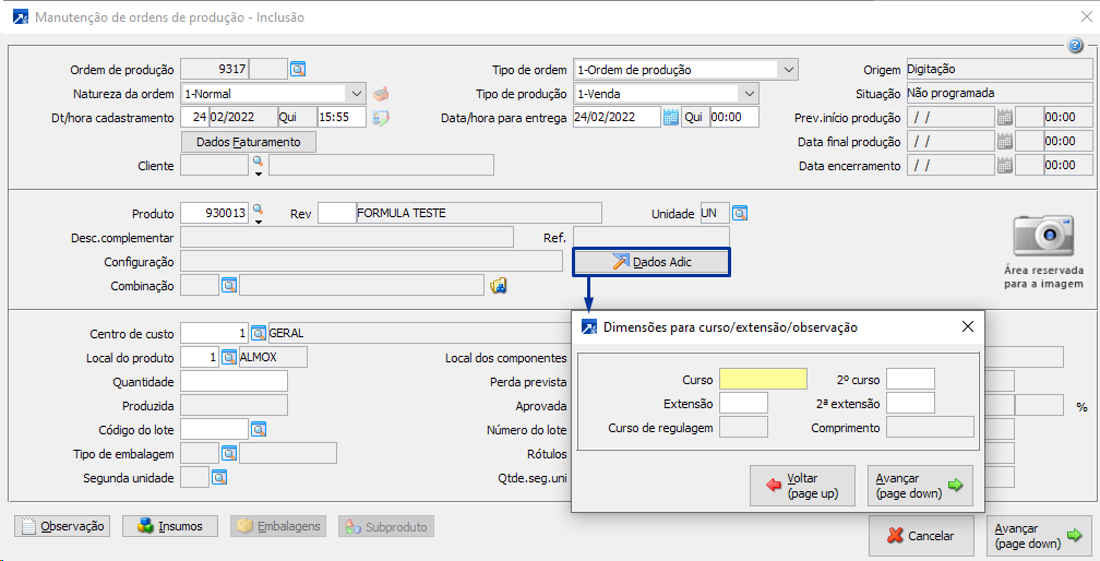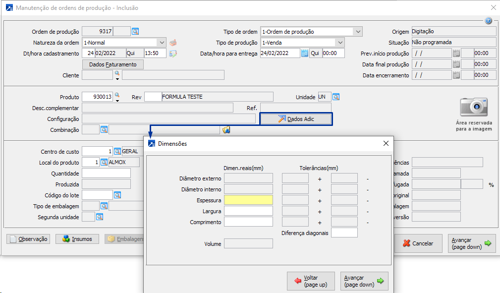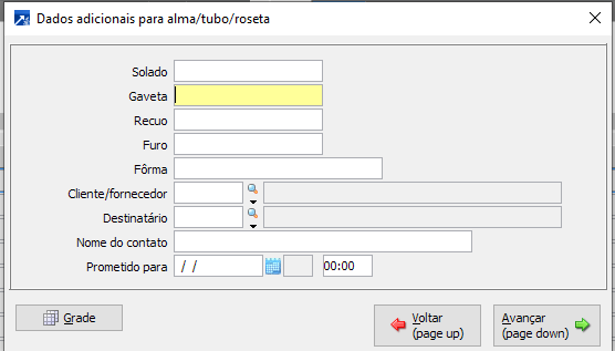 12-Alma/Tubo/Roseta: Na manuntenção da formulação deste grupo, o SIGER® irá abrir ao final da manutenção uma janela possibilitando ao usuário informar dados para alma/tubo/roseta. Para que o SIGER® habilite esse janela, é necessário que o produto da formulação tenha uma grade padrão cadastrada. + Saiba mais