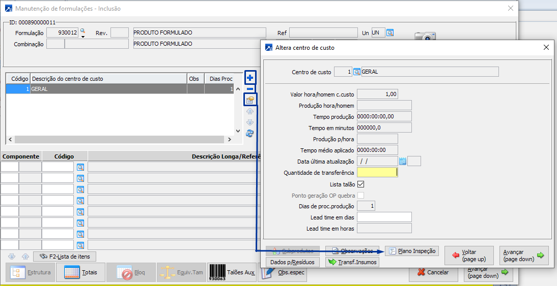 ![]() 13-Plano de inspeção: Na manuntenção da formulação deste grupo, através do botão de inclusão ou alteração de centro de custo da formulação, o SIGER® irá habilitar o botão <Plano de inspeção>.