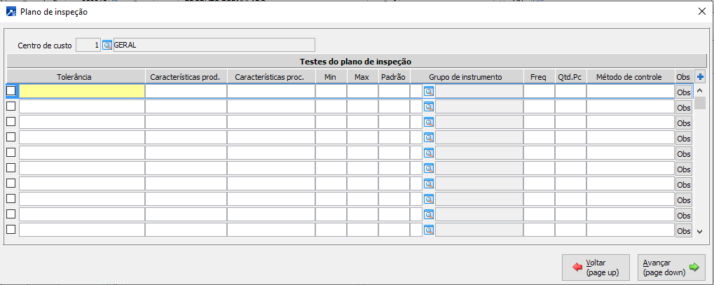 ![]() Acessando o botão <Plano Inspeção>, o SIGER irá exibir a janela de plano de inspeção e usuário poderá cadastrar conforme sua necessidade.