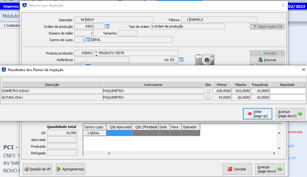 ![]() No momento que efetuar o apontamento de produção, será exibido uma janela com os dados cadastrados e solicitando para o operador que estiver efetuando o apontando informar os resultados obtidos: