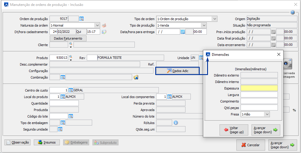 2-Não: Não irá permitir que seja feita a manutenção dos insumos da OP no retorno do serviço externo.