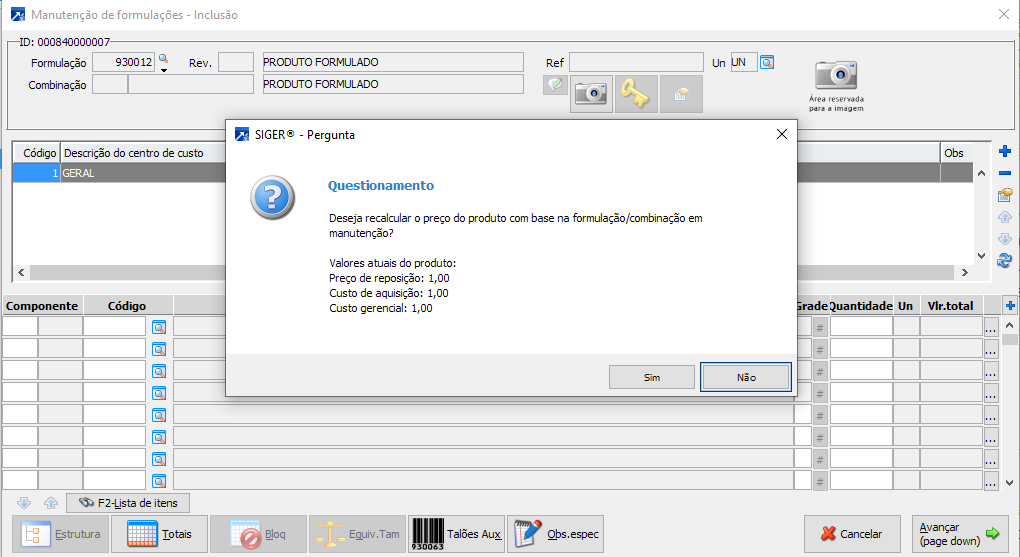 Ao fazer a inclusão ou manutenção da formulação do produto, o SIGER® permitirá ao usuário fazer a replicação dos valores dos insumos com base no consumo da formulação para calculo do preço do produto a ser produzido.