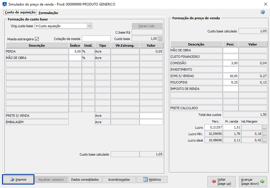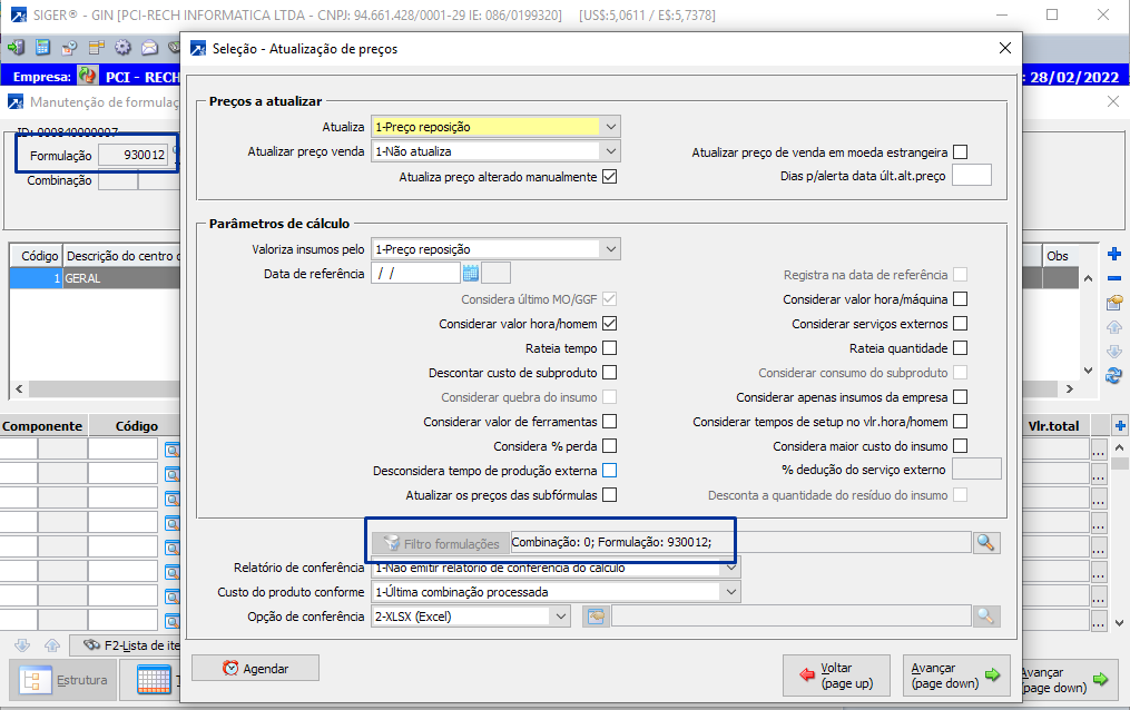 ![]() Caso o usuário seleciona a opção "Sim" o SIGER® irá abrir o menu de atualização de preços do produto fabricado 1.7-P + Saiba mais filtrando somente a formulação em questão: