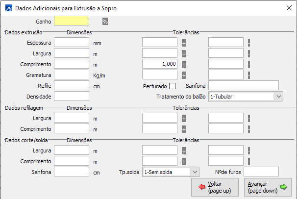 03-Extrusão a sopro: Na manutenção da formulação deste grupo, o SIGER® irá abrir ao final da manutenção uma janela possibilitando ao usuário informar dados de extrusão a sopro.