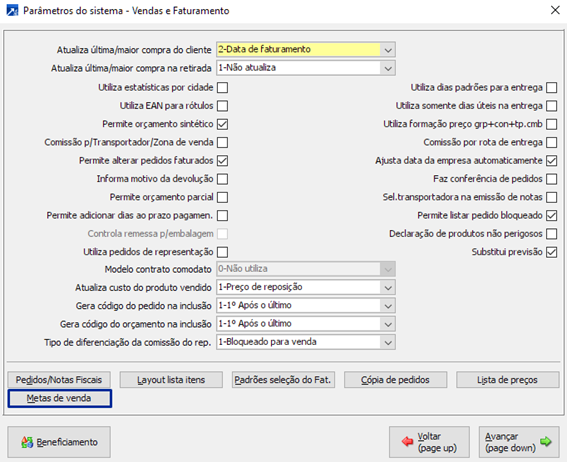Campo: “Utiliza meta diária fat.p/representante”: Ao marcar esta “flag” será indicado que a empresa deseja usar controles de meta diários em relação aos valores faturados.