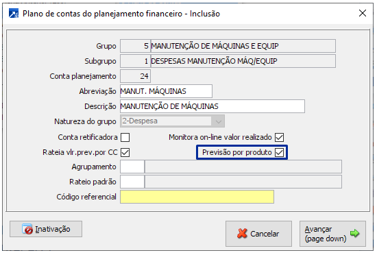 Na conta de planejamento financeiro será habilitado o "Previsão por produto", para as contas que a empresa definir o controle por produto, devem ser marcadas este campo.