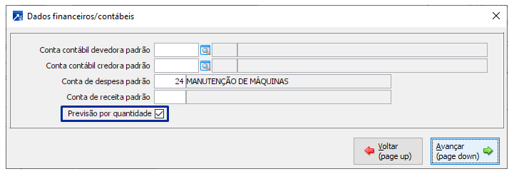 Importante: Para inclusão dos valores previstos por produto é necessário marcar o campo "Previsão por quantidade" no cadastro do(s) produto(s), menu 1.6-A e botão <Finan/Contab>. O módulo controle financeiro não possui o menu de manutenção de produtos, então essa configuração deve ser realizado nos demais módulos que possuem o menu 1.6, por exemplo módulo vendas e faturamento, controle de estoques, compras, gestão industrial, entre outros.