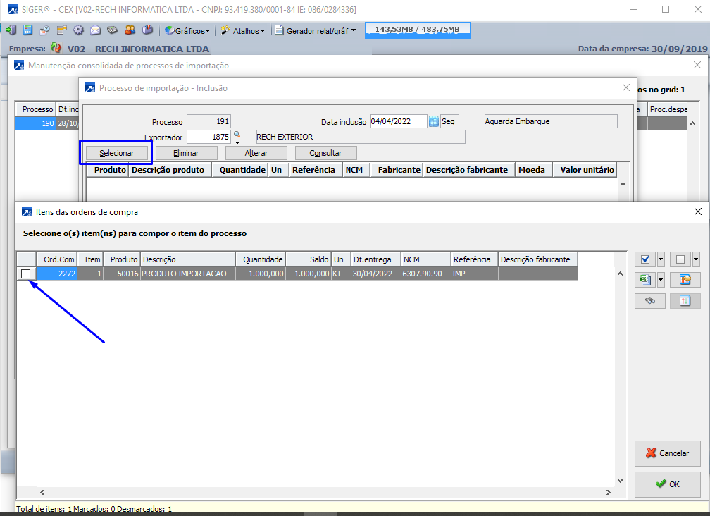 Através do botão <Incluir> é que será incluso um novo processo. Inicialmente é necessário informar o Exportador e depois clicar no botão <Selecionar>. Serão exibidos os itens da PO´s do Exportador. Basta marcar os itens desejados.