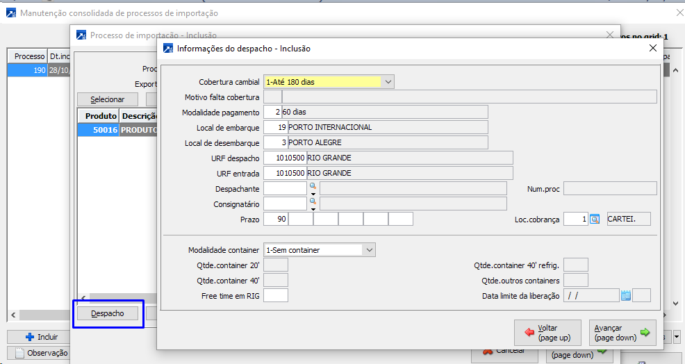 No botão <Despacho> são carregadas as informações já informadas na PO, com possiblidade de alteração.