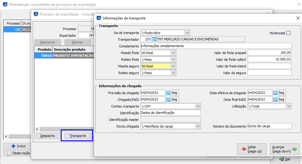 Vamos detalhar alguns dos campos da janela de "Informações do transporte: