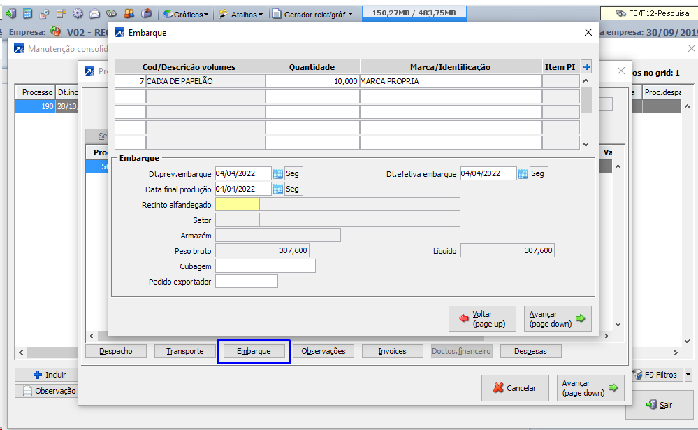 No botão "Embarque" serão identificados os volumes e características de armazenamento dos produtos.